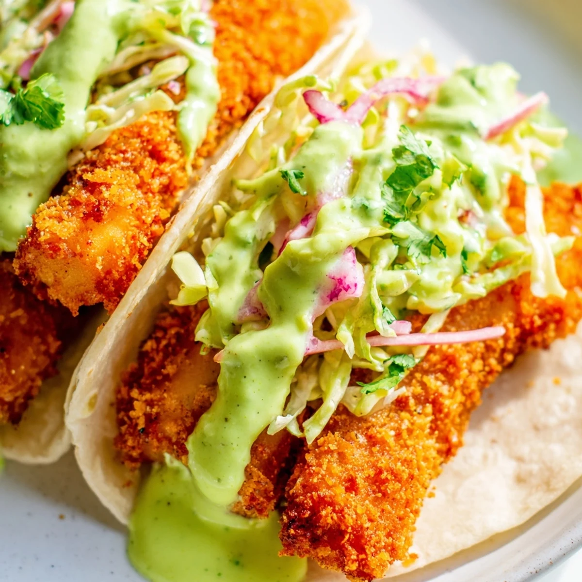 - Pile that crispy fish into warm tortillas, top with a generous handful of slaw and drizzle with avocado crema. Squeeze fresh lime over everything and serve immediately.