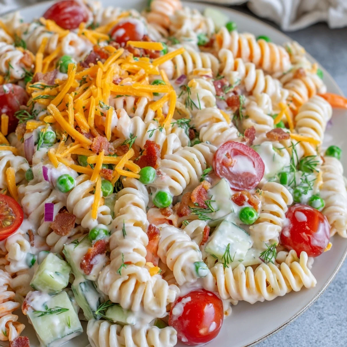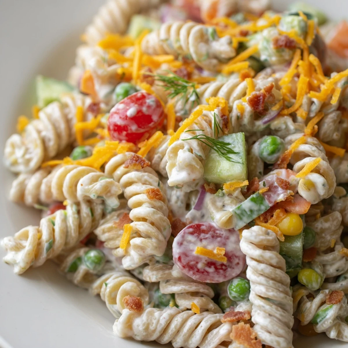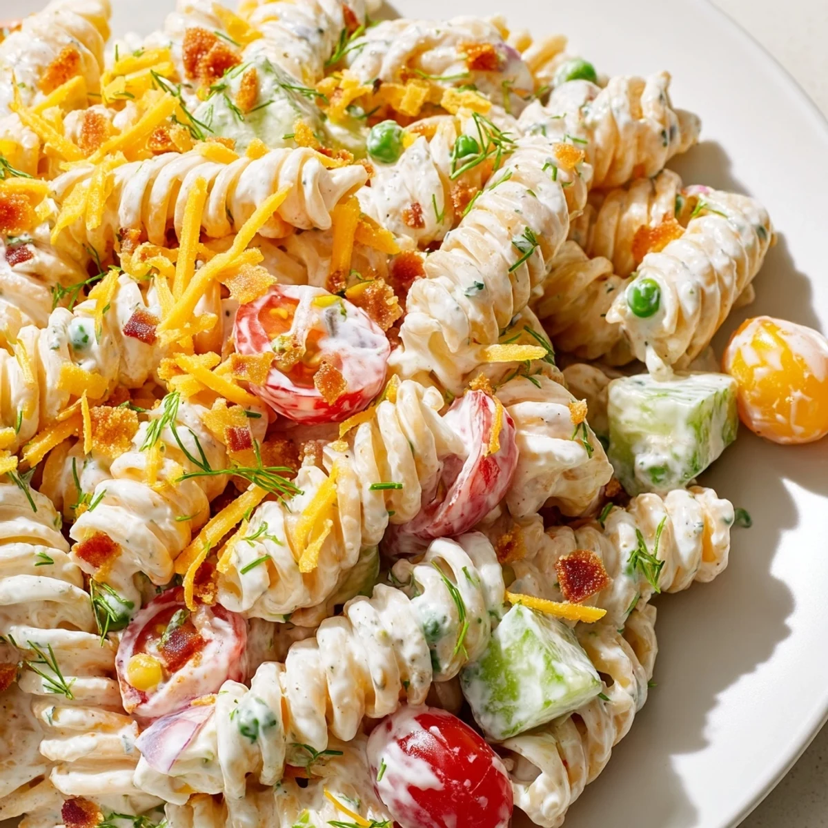 This vibrant pasta salad combines al dente noodles with a tangy homemade ranch dressing, crisp cherry tomatoes, crunchy cucumbers, bell peppers, red onions, and sweet peas. The creamy dressing gets its zest from fresh dill and chives, while garlic and onion powder add savory depth. Ready in just 25 minutes, this make-ahead dish tastes even better after chilling, making it perfect for meal prep, potlucks, or summer gatherings. Add optional cheddar cheese or crispy bacon for extra richness.