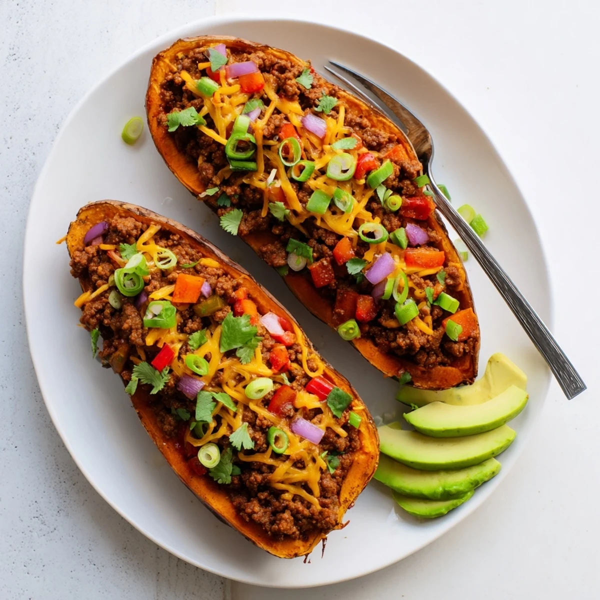 Lean ground beef gets seasoned with smoked paprika, cumin, and chili powder, then finished with a drizzle of hot honey for that addictive sweet-heat balance. The filling is piled into fluffy, fork-tender sweet potatoes and topped with cheese, fresh cilantro, and creamy avocado slices.