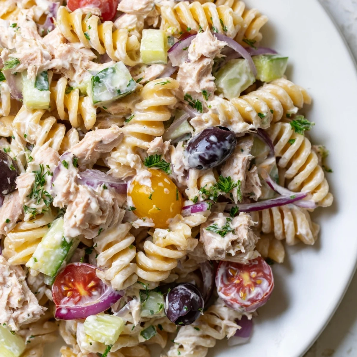 This tuna pasta salad combines tender cooked pasta with protein-rich tuna and fresh vegetables like cherry tomatoes, cucumber, and celery. The creamy dressing blends mayonnaise with Greek yogurt and Dijon mustard for a tangy finish that coats every bite.